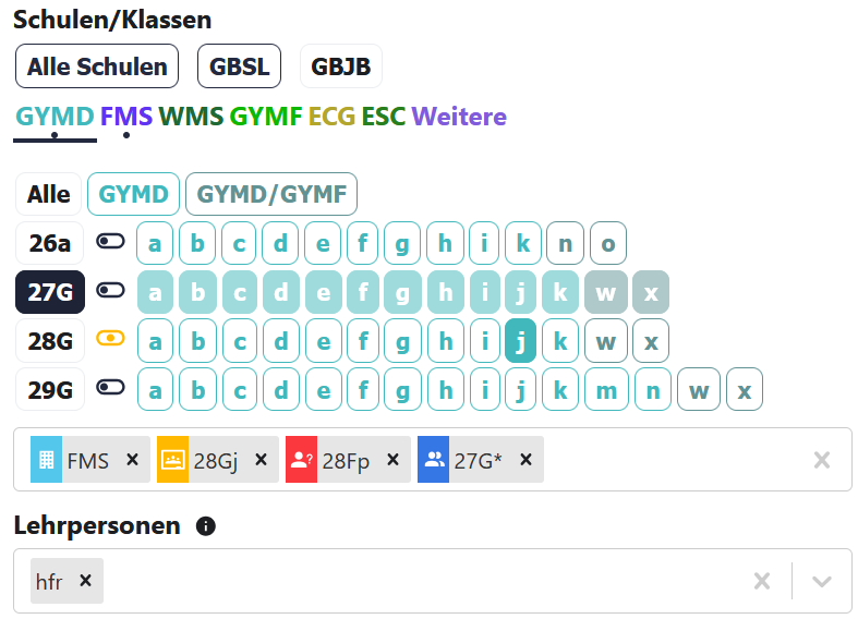 Ein Klassenjahrgang betrifft alle Klassen eines ganzen Jahrgangs. Dies wird mit einem * angezeigt. Z.B. 29G* für alle 29er Klassen des Gymnasiums oder 29F* für alle 29er Klassen der FMS.